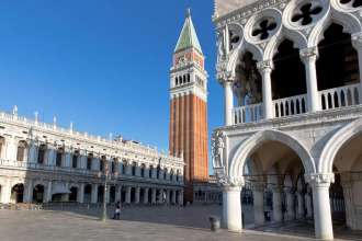 В 14-16 веках закладывался архитектурный облик Венеции, вобравший в себя традиции византийцев, арабов и готические мотивы. Центр города просто заполнен архитектурными шедеврами. Площадь Святого Марка, вымощенную мрамором, украшенную пятиугольным одноименным собором, возведенным в 829 -832 годы и перестроенным в 11-м веке, обрамляют мраморные здания Старых (нач. 15 – начало 16 вв.) и Новых Прокураций (16-17 вв.). Собор украшен бронзовыми византийскими дверьми 11-го века и четырьмя бронзовыми конями 4-3 веков до нашей эры, привезенными в 1204-м году из Константинополя и возвышающиеся над центральным порталом. В интерьере храма использованы мозаики 12-14 веков, мозаичные мраморные полы, а также разнообразие скульптур, барельефов, колонн и драгоценностей, привозившихся как трофеи в разные времена. Ещё одним украшением площади Святого Марка является 100-метровая кампанила – колокольня, претерпевавшая изменения с конца восьмого века до начала 20-го. У её подножья расположена маленькая Лоджетта (с 1517 г.), которая использовалась как трибуна для венецианских нобилей в дни празднеств и торжественных церемоний. На этом список шедевров площади Сан-Марко не заканчивается. Небольшая Пьяцетта – «площадочка» – примыкает к площади и выходит на лагуну. По сторонам Пьяцетты располагаются Старая библиотека Сан-Марко (1536-1554 гг.) из белого мрамора и великолепный Дворец дожей 9-го века, работы над обликом которого были завершены в 14-16 веках, с мраморными лоджиями и фасадом. К восточной части Дворца дожей примыкает легендарный Мост Вздохов, опутанный романтическими поверьями и печальными подробностями. А к северу расположена площадь Санти-Джо-ванни э Паоло, на которой красуется одноименная готическая церковь(1246-1430 гг.), конный памятник кондотьеру Коллеони 15 века и общественное здание Скуола Гранде ди Сан-Марко (1488-90 гг.). Эти здания и площадь являются одним из лучших архитектурных ансамблей города.