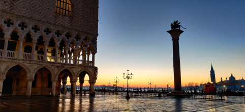 В 14-16 веках закладывался архитектурный облик Венеции, вобравший в себя традиции византийцев, арабов и готические мотивы. Центр города просто заполнен архитектурными шедеврами. Площадь Святого Марка, вымощенную мрамором, украшенную пятиугольным одноименным собором, возведенным в 829 -832 годы и перестроенным в 11-м веке, обрамляют мраморные здания Старых (нач. 15 – начало 16 вв.) и Новых Прокураций (16-17 вв.). Собор украшен бронзовыми византийскими дверьми 11-го века и четырьмя бронзовыми конями 4-3 веков до нашей эры, привезенными в 1204-м году из Константинополя и возвышающиеся над центральным порталом. В интерьере храма использованы мозаики 12-14 веков, мозаичные мраморные полы, а также разнообразие скульптур, барельефов, колонн и драгоценностей, привозившихся как трофеи в разные времена. Ещё одним украшением площади Святого Марка является 100-метровая кампанила – колокольня, претерпевавшая изменения с конца восьмого века до начала 20-го. У её подножья расположена маленькая Лоджетта (с 1517 г.), которая использовалась как трибуна для венецианских нобилей в дни празднеств и торжественных церемоний. На этом список шедевров площади Сан-Марко не заканчивается. Небольшая Пьяцетта – «площадочка» – примыкает к площади и выходит на лагуну. По сторонам Пьяцетты располагаются Старая библиотека Сан-Марко (1536-1554 гг.) из белого мрамора и великолепный Дворец дожей 9-го века, работы над обликом которого были завершены в 14-16 веках, с мраморными лоджиями и фасадом. К восточной части Дворца дожей примыкает легендарный Мост Вздохов, опутанный романтическими поверьями и печальными подробностями. А к северу расположена площадь Санти-Джо-ванни э Паоло, на которой красуется одноименная готическая церковь(1246-1430 гг.), конный памятник кондотьеру Коллеони 15 века и общественное здание Скуола Гранде ди Сан-Марко (1488-90 гг.). Эти здания и площадь являются одним из лучших архитектурных ансамблей города.